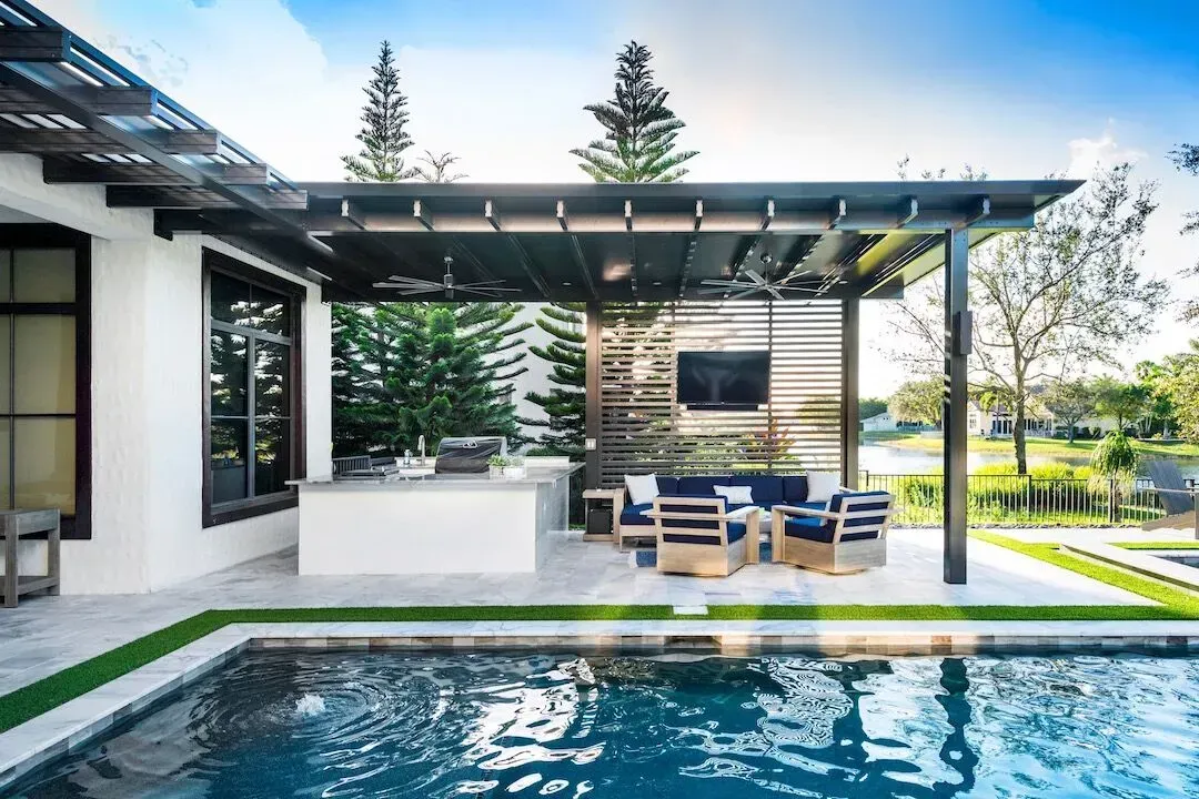 Want to let the sun shine in? Opt for a Renaissance pergola over a patio cover. Models like the Aria can include a shade lattice that only partially blocks the sun or a solid cover to fully block the sun and keep out the rain.